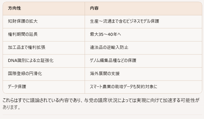 国会審議は比較的スムーズに進む可能性があります。● ② 農水省の既存方針(海外流出防止・知財強化)がさらに加速
